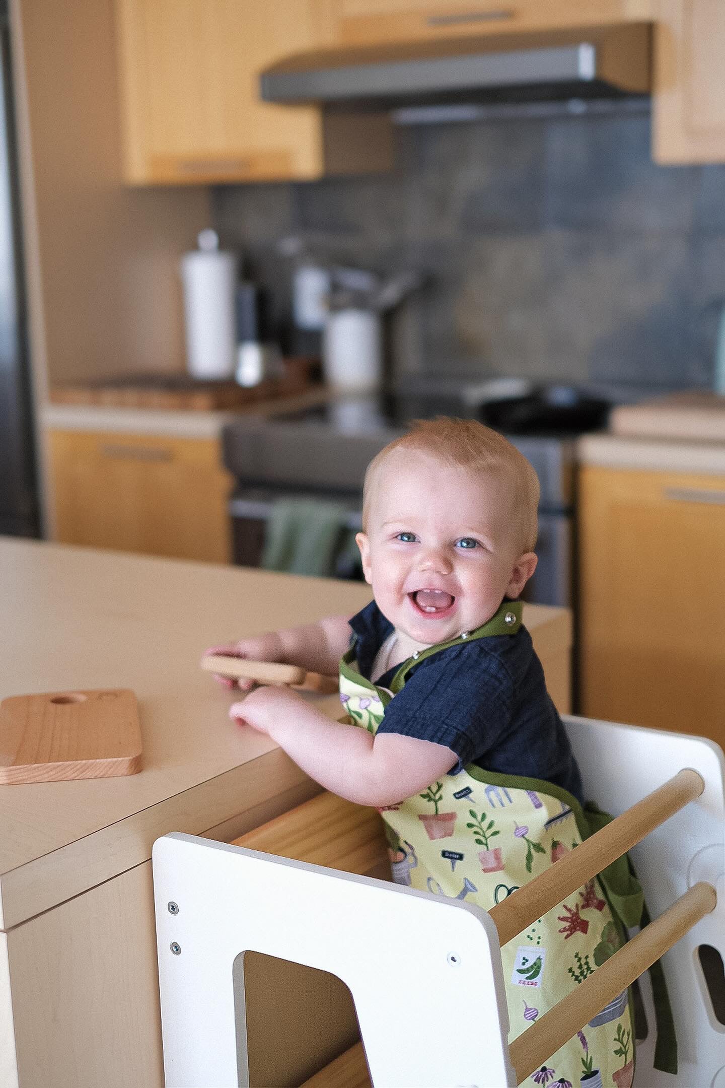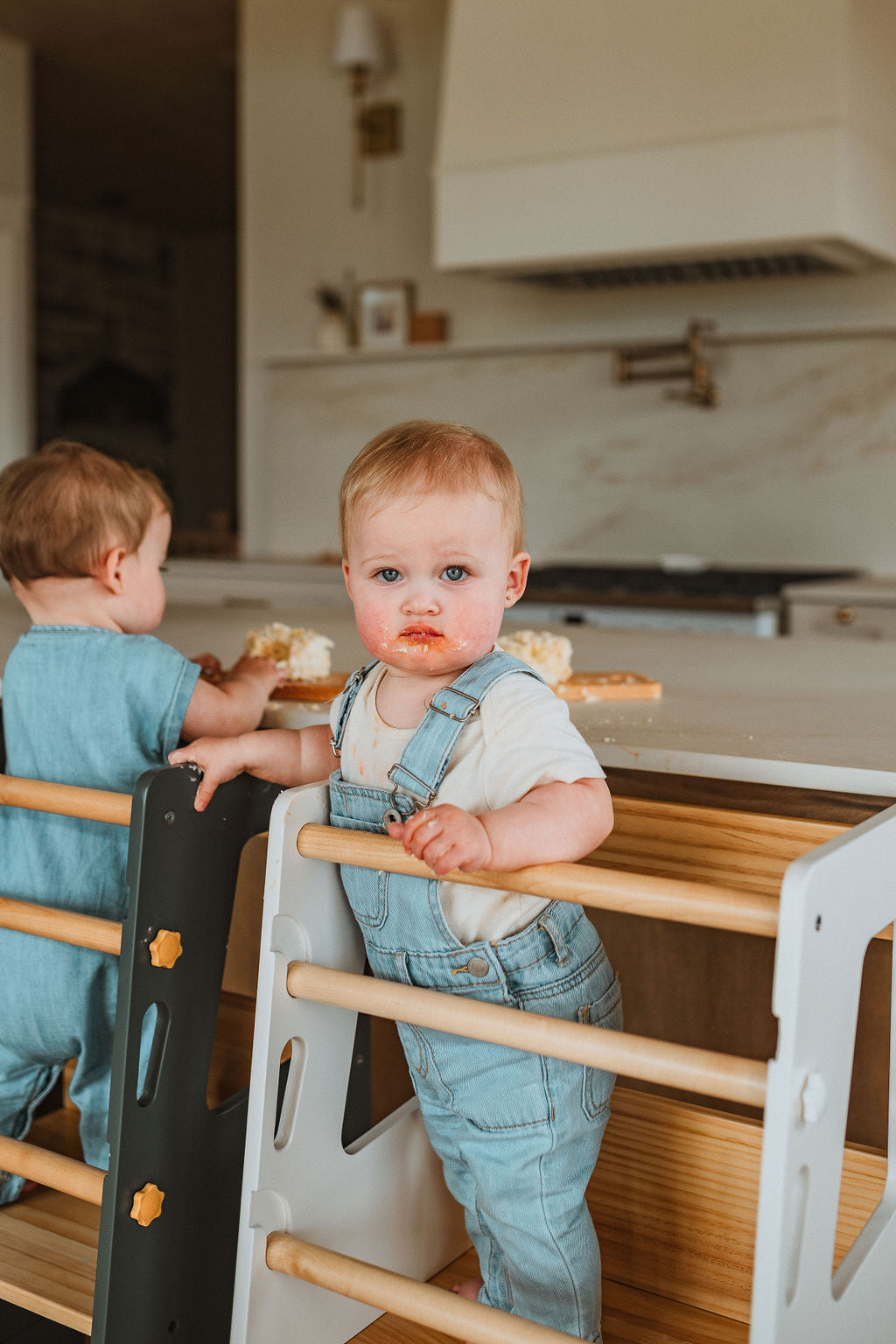 Your child stands safely beside you — ready to mix, pour, and help out.